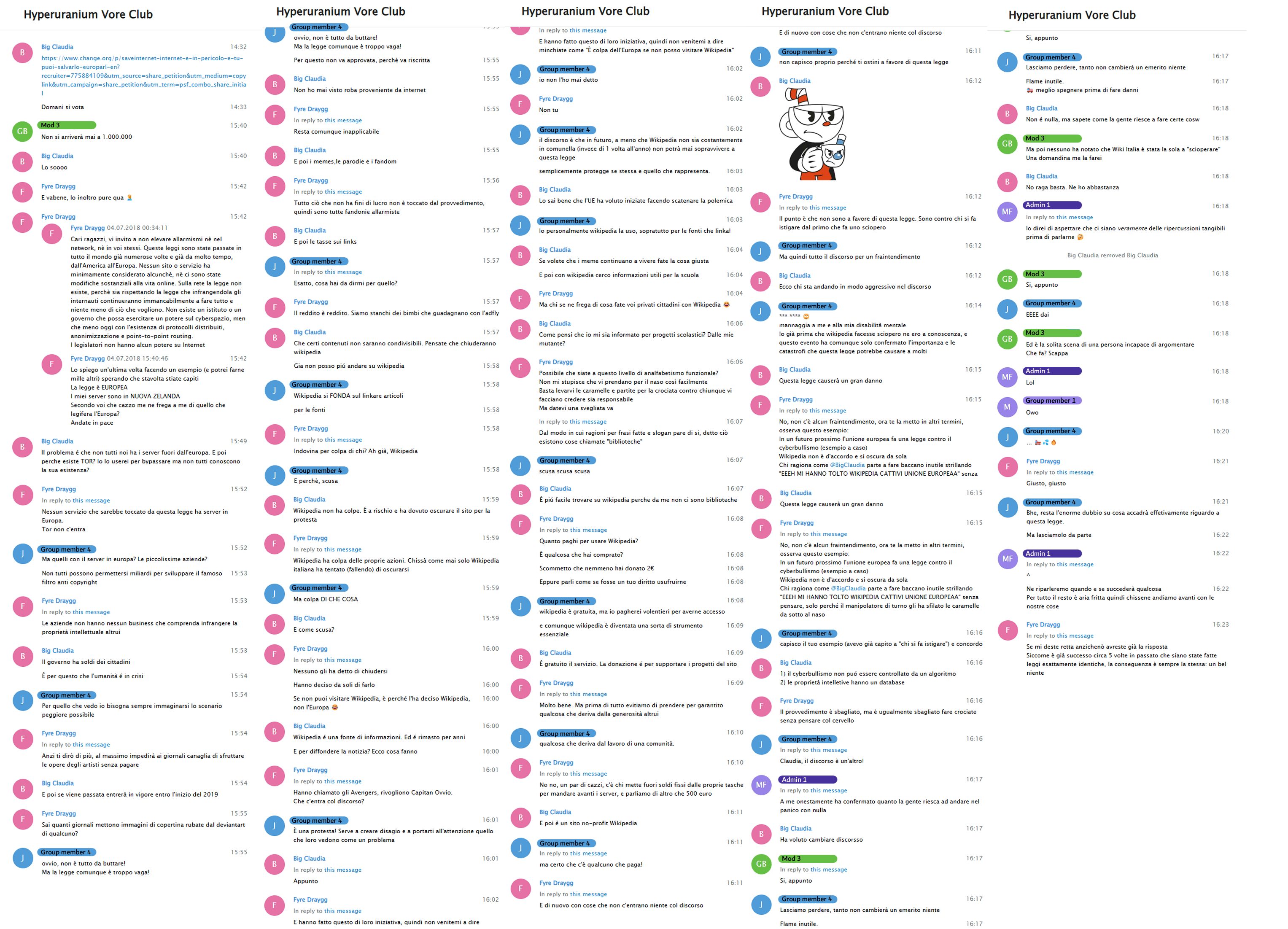 The law and its potential reach were discussed at length on Hyperuranium Network in the topic-appropriate group chats. When the public discourse on the subject became too heated and too polarised, the Administration Team issued a Network-wide ban on the subject, forbidding users from posting about it; BigClaudia was well aware of this since she was an active member of the Café group where the original heated arguments and subsequent instating of the rule occured. Please note that, even before this measure, political debate was only appropriate in the group chats dedicated to the topic: Hyperuranium Vore Club was not such a group.